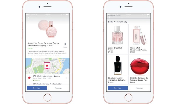 - Disponibilités locales : sur une publicité pour un produit, un indicateur de distance montre la disponibilité du produit à proximité. Si le produit est disponible en magasin à 400 mètres, ce sera indiqué sur la publicité, et un plan menant au magasin sera aussi affiché. Si un produit est en rupture de stock, la campagne s’ajuste automatiquement pour que la publicité ne s’affiche pas pour les utilisateurs de cette région.