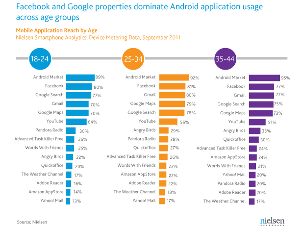 Le cabinet d’études Nielsen vient de publier son classement des applications les plus utilisés sur les smartphones tournant sur Android, au cours des 30 derniers mois. Le palmarès est établi pour trois tranches d’âge (18-24 ans, 25-34 ans, et 35-44 ans). il concerne uniquement le marché américain,mais donne une bonne image de l’usage des smartphones, que l’on imagine pas si différent que ça dans les autres pays. Mis à part l’Android Market, qui sert à télécharger toutes les autres applications, Facebook est l’app la plus utilisée toute population confondue… Par plus de 80% des 18 à 35 ans, et 77% des 35-44 ans tout de même. Enorme succès pour le réseau social, qui va donc même jusqu’à dépasser les services de Google… C’est la première fois qu’un éditeur tiers est numéro 1 sous Android.