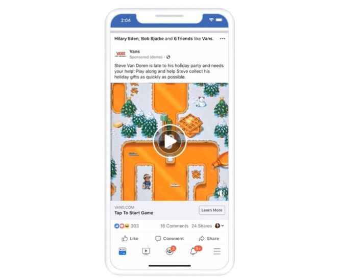 Les Playable Ads sont elles aussi généralisées à tous les annonceurs, à partir d’aujourd’hui. Elles permettent de créer des mini jeux, intégrés et jouables dans une publicité. Cette gamification est d’après Facebook un excellente vecteur de business, et de conversion.