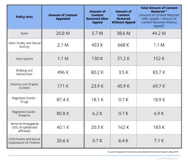 « La quantité de contenus ayant fait l’objet d’un recours au cours d’un trimestre ne peut pas être directement comparé à la quantité de contenus rétablis au cours de ce trimestre, indique Facebook, dans la mesure où les contenus rétablis au cours du premier trimestre 2019 peuvent avoir fait l’objet d’un recours au quatrième trimestre 2018. De la même manière, la quantité de contenus ayant fait l’objet d’un recours au premier trimestre 2019 pourrait avoir fait l’objet de mesures au quatrième trimestre 2018. »