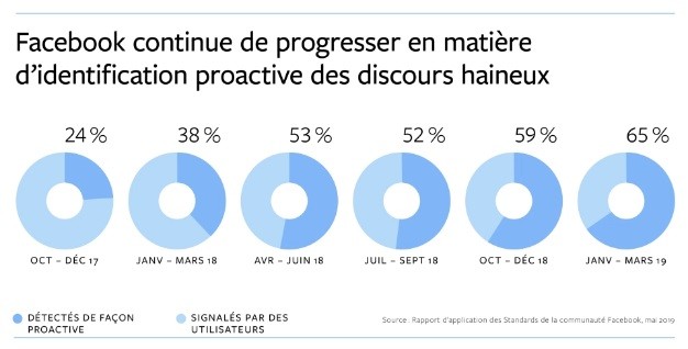 D’autre part, la plateforme estime que 95% des contenus pour lesquels elle a pris des mesures ont été détectés grâce à sa proactivité, c’est-à-dire sa capacité à repérer des contenus problématiques avant même que ceux-ci soient signalés par les utilisateurs. Facebook déclare avoir identifié 65% des discours haineux avec cette technologie.