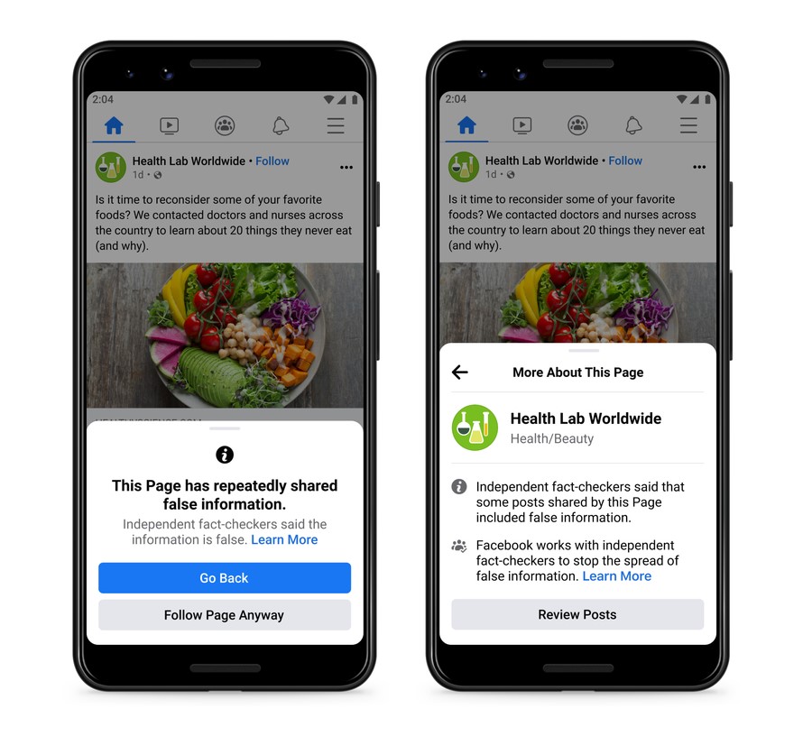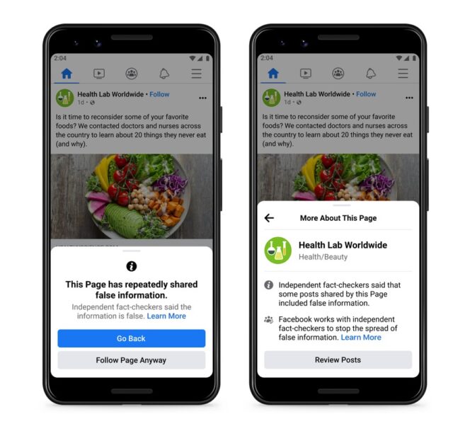 Facebook a également mis en place de nouvelles fenêtres contextuelles à destination des utilisateurs. Ils seront avertis lorsqu’une page a partagé plusieurs contenus comportant des fausses informations, lors de sa consultation. Le but : responsabiliser les internautes et les laisser décider de suivre ou non cette page, en toute connaissance de cause.