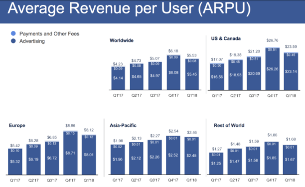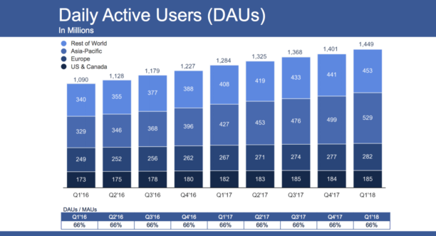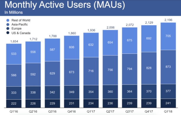 Au niveau des utilisateurs actifs mensuels, Facebook compte 70 millions d’utilisateurs supplémentaires, un chiffre en hausse de 3,39%. Les utilisateurs quotidiens et mensuels ont augmenté de 13% sur un an. Pas mal pour une entreprise dont le déclin est perpétuellement annoncé… Même aux USA et au Canada, particulièrement touchés par le scandale Cambridge Analytica, Facebook retrouve la croissance.