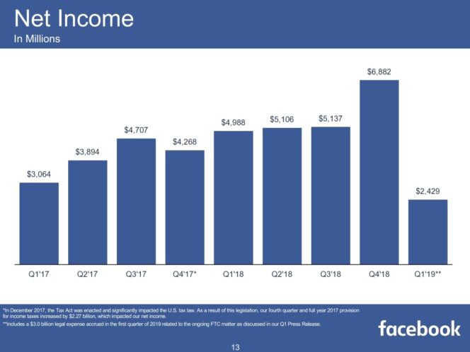 Par contre, le bénéfice net est en recul puisqu’il est aujourd’hui à 2,43 milliards de dollars, soit 85 cents par action, alors qu’il était 4,99 milliards dollars, soit 1,69 dollar par action, l’année dernière. Malgré une provision de 3 milliards de dollars, le bénéfice opérationnel de Facebook sur le trimestre s’élève à 3,3 milliards de dollars soit 22% de son chiffre d’affaires.