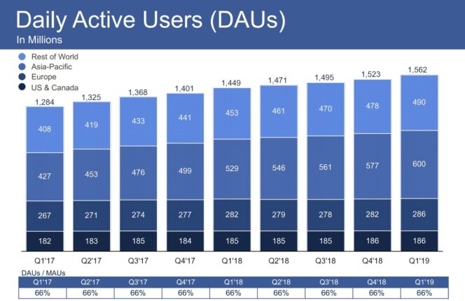 Du côté des utilisateurs, le nombre d’actifs tous les mois sur le réseau social a atteint 2,375 milliards de personnes ; dont 1,56 milliard d’utilisateurs actifs chaque jour (DAU).