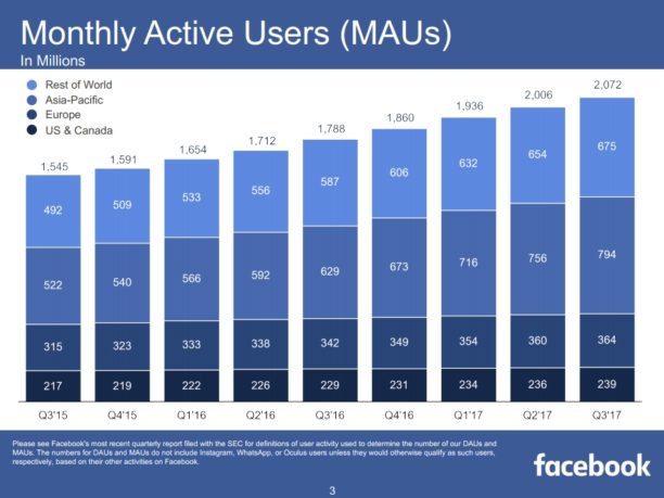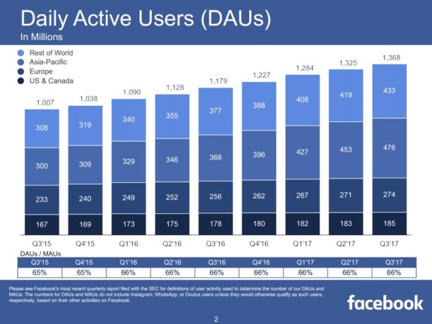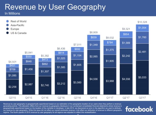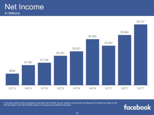 Du côté des chiffres financiers, les résultats sont aussi impressionnants. Facebook passe le cap des 10 milliards de dollars de chiffre d’affaires en trois mois, pour la première fois de son histoire. Au troisième trimestre 2017, le réseau social a généré un bénéfice net de 4,7 milliards de dollars.