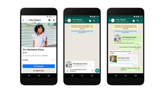 Facebook offre également la possibilité aux entreprises de se connecter plus rapidement à leurs clients, en utilisant ses différentes plateformes de messagerie en ligne : Messenger, WhatsApp et Instagram Direct. De nouveaux boutons de messagerie sont proposés sur les boutiques pour permettre aux utilisateurs de poser des questions aux vendeurs. Ces derniers pourront ainsi assurer une assistance personnalisée pendant le parcours d’achat de leurs clients ou prospects.