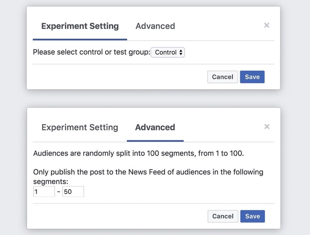 Comme l’illustre le screenshot ci-dessous, publié par Jane Manchun Wong et relayé par Matt Navarra sur Twitter, Facebook permet à certains administrateurs de pages d’effectuer un test. Vous pouvez ainsi proposer des publications différentes à un groupe témoin (Control) et un groupe sélectionné pour le test. Vous pouvez aller plus loin en choisissant précisément le segment ciblé pour votre test A/B. Vous obtenez ensuite des statistiques vous permettant de connaître la version la plus efficace.
