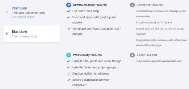 Vous pourrez donc bientôt opter pour Workplace Premium (la version payante) ou Workplace Standard (la version gratuite). Globalement, Facebook va utiliser le même modèle que Slack. Les fonctionnalités liées à la communication (Workchat, appels vidéo et audio, live streaming, applications mobiles) et à la productivité (stockage de fichiers, photos et vidéos illimité, nombre d’équipes et de projets illimités, collaboration inter-entreprises…) seront disponibles gratuitement. En revanche, vous devrez opter pour Workplace Premium pour accéder aux fonctionnalités avancées : outils d’administration, single sign-on, intégration avec des services tiers comme G Suite…).