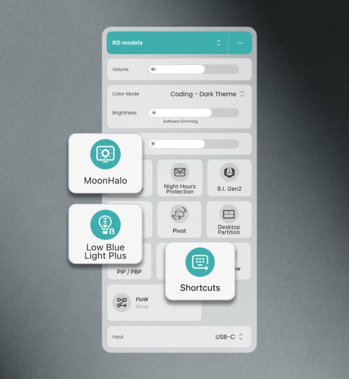 Un des gros points forts des écrans RD lancés par BenQ est l’intégration de la technologie MoonHalo : un système de rétroéclairage indirect placé derrière l’écran à partir des modèles de 28 pouces, réduisant l’agressivité lumineuse perçue par l’œil. Ce rétroéclairage léger à l’arrière de l’écran permet aux développeurs travaillant de longues heures dans une faible luminosité de bénéficier d’un confort visuel accru et de pouvoir travailler plus longtemps sans se fatiguer.