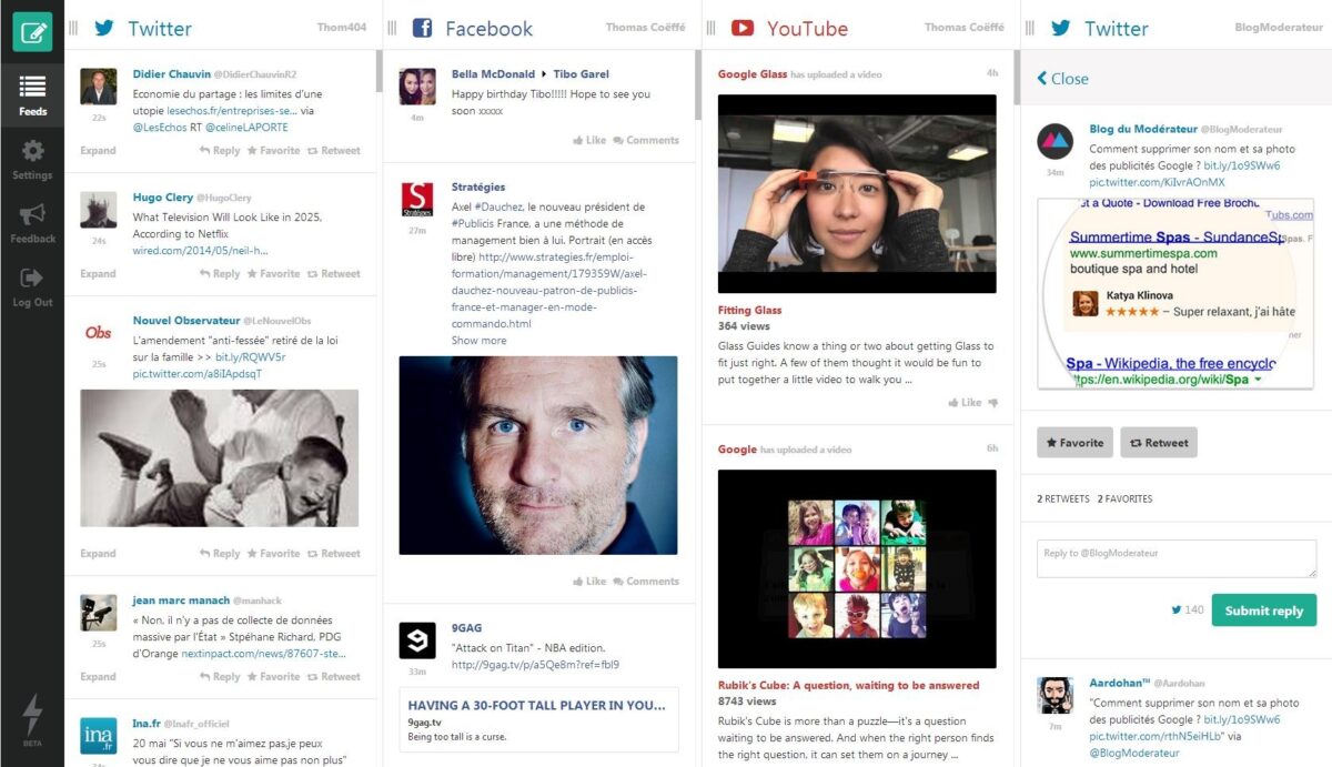 Une fois inscrit et connecté, il suffit d’ajouter les comptes des réseaux sociaux auxquels vous souhaitez accéder. Vous pouvez ajouter plusieurs comptes d’un même réseau social si vous le souhaitez (contrairement à la version gratuite d’HootSuite). Ensuite, il vous suffit de cliquer sur « Feeds », en haut du menu latéral, pour accéder à vos fils d’actualité. L’interface ressemble beaucoup à HootSuite : chaque flux est affiché au sein d’une colonne, que vous pouvez déplacer. Vous n’avez pas besoin de rafraîchir la page pour voir les nouvelles publications : les colonnes sont mises à jour en temps réel.