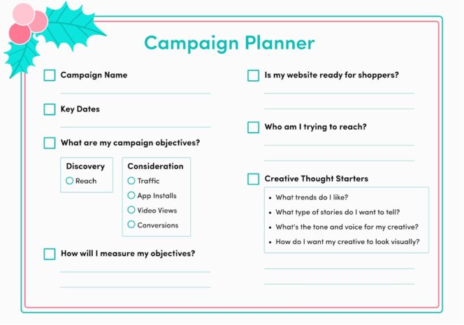 Pinterest a identifié 6 principaux personae pour la saison des fêtes : les « early birds », les traditionnalistes, ceux qui aiment se faire des cadeaux, ceux qui reçoivent pour la première fois, ceux qui se font livrer en avance et les hôtes d’exception. Pour les atteindre, la plateforme recommande de suivre les étapes suivantes, qui vous permettra de poser les bases de votre stratégie de campagne :