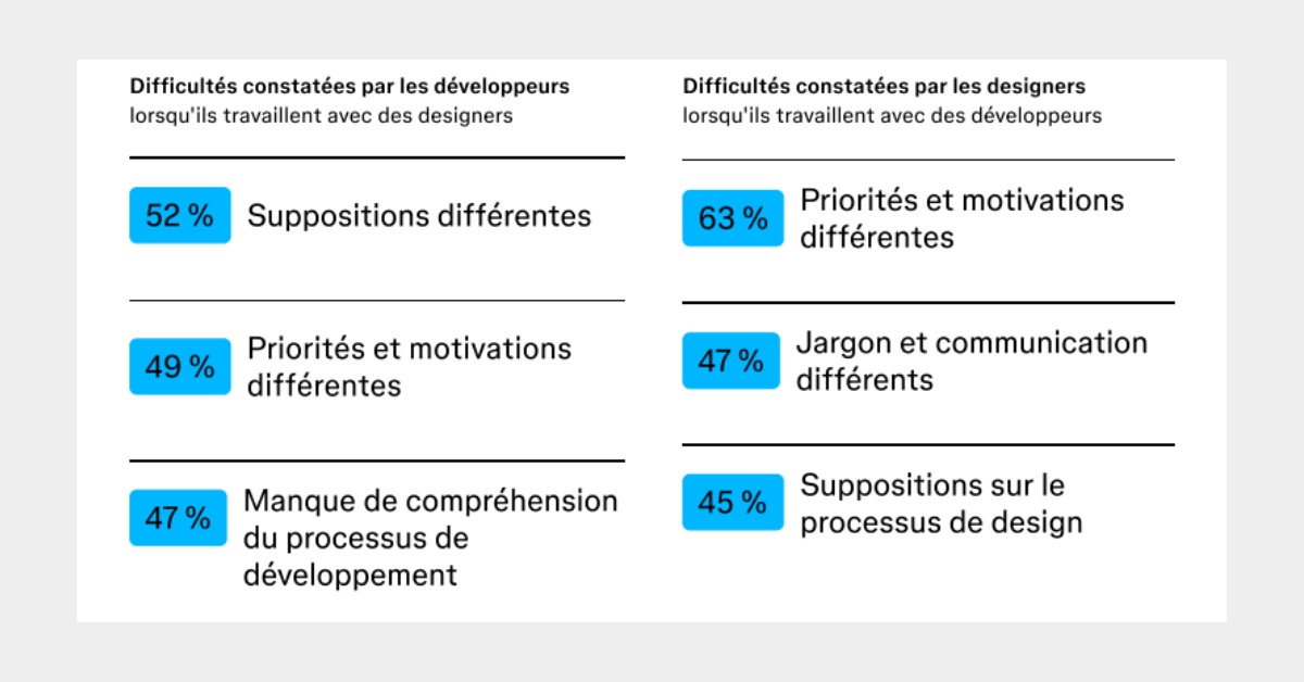 L’importance de cette collaboration inter-équipes semble de plus en plus prise en compte. En effet, 59 % des développeurs font part d’une « hausse importante » des réunions avec les designers par rapport à l’an dernier. Cependant, des points restent améliorables pour mieux collaborer : l’étape du handoff – du passage de témoin entre les équipes – peut être optimisée pour 91 % des développeurs et 92 % des designers. Pour ces deux corps de métier, il existe des points d’achoppement : manque de compréhension de certains processus, priorités et motivations différentes, jargon distinct…