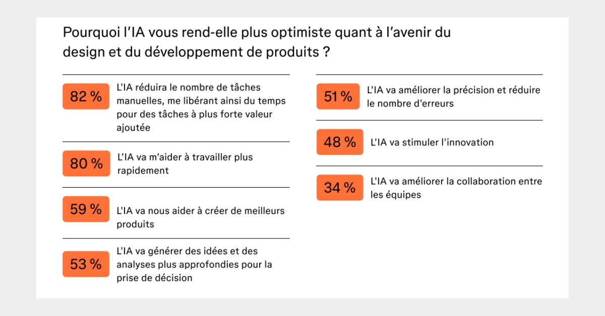 Parallèlement, l’IA ne se contente plus de faire le buzz, elle s’affirme comme un levier majeur pour transformer les pratiques de design et de développement. Selon le rapport de Figma, près de la moitié des sondés estime que l’IA aura un impact significatif sur leurs outils au cours des 12 prochains mois. Elle suscite en effet un optimisme marqué, notamment en raison de sa capacité à automatiser des tâches répétitives, libérant du temps pour des missions à plus forte valeur ajoutée. 82 % des designers et développeurs interrogés voient dans l’intelligence artificielle un moyen de se concentrer sur la créativité et l’innovation.