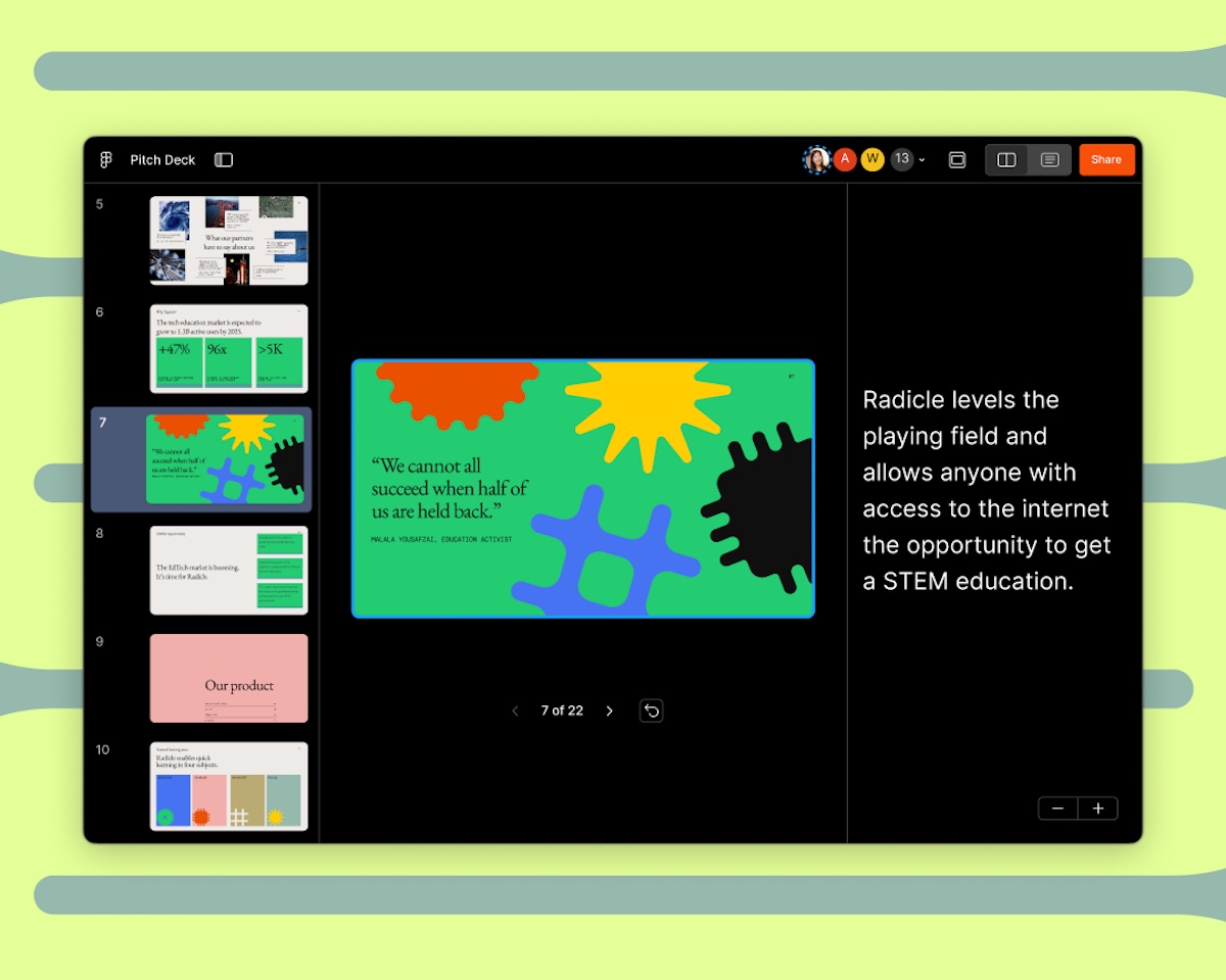 Slides canalise la puissance de Figma sous une forme spécialement conçue pour raconter votre histoire, s’enthousiasme Mihika Kapoor, product manager. Après tout, la communication visuelle est la forme la plus puissante de storytelling.