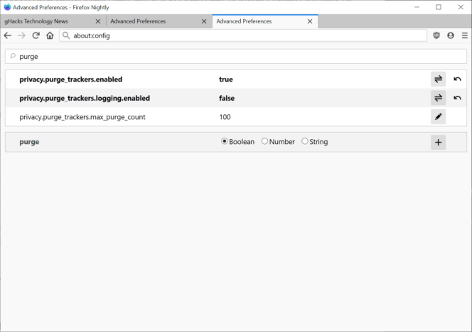 Si vous ne souhaitez pas que Firefox purge automatiquement les données et les cookies d’un site, vous devrez définir la préférence « privacy.purge_trackers.enabled » sur « false » dans les paramètres avancés de votre navigateur, où sont accessibles et modifiables ces trois types de préférences.