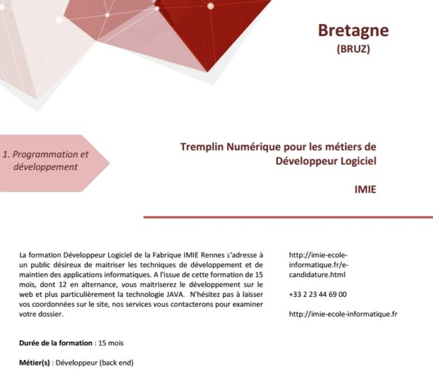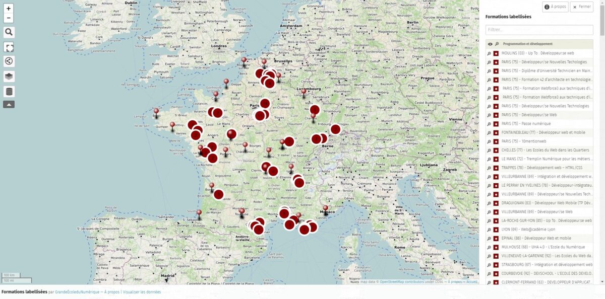 La Grande École du Numérique est « un réseau de formations gratuites et ouvertes à toutes et tous pour réussir la transformation numérique ». Il s’agit d’un Groupement d’Intérêt Public (GIP) lancé en 2015 par 17 institutions publiques et entreprises privées (Ministères, Secrétaire d’État, Pôle Emploi, Google, Cap Gemini…).