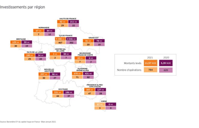 Du côté des régions, l’Île-de-France rassemble 80 % des investissements en valeur de l’année 2021, soit 9,288 milliards d’euros contre 4,046 milliards en 2020. Elle devance l’Auvergne-Rhône-Alpes, qui conserve sa 2e position, avec 5,8 % des investissements (670 millions d’euros). La région Occitanie se place juste derrière avec 4,16 % des investissements en valeur (531 millions d’euros).