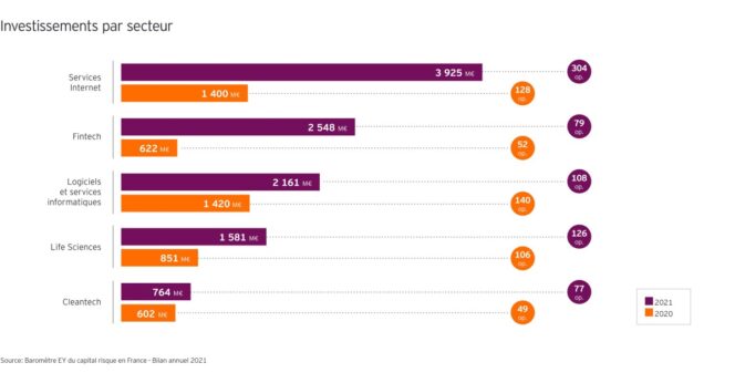 Les Services Internet représentent le secteur le plus attractif de la French Tech avec 304 opérations enregistrées pour 3,925 milliards d’euros levés (vs 128 opérations pour 1,4 milliard d’euros en 2020). Derrière, on retrouve les Fintech (2,548 milliards d’euros), les logiciels et services informatiques (2,161 milliards), les Life Sciences (1,581 milliard d’euros) et Cleantech (764 millions d’euros).