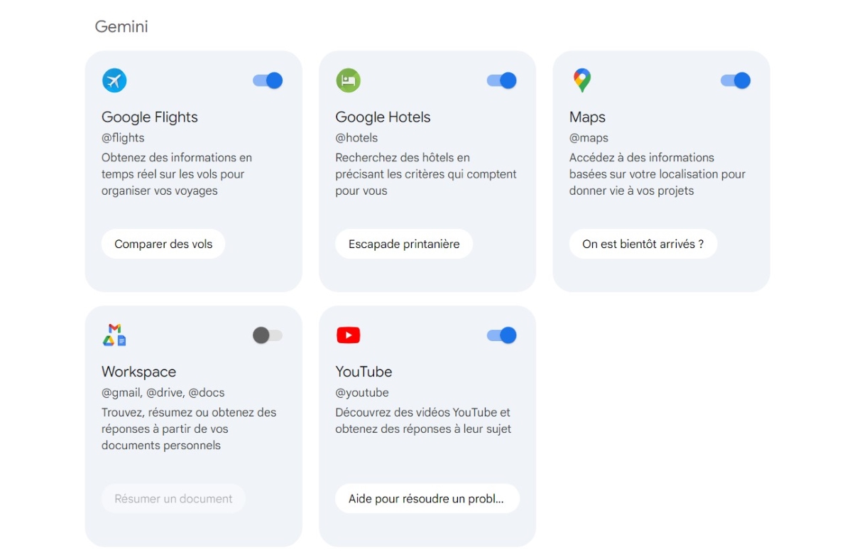Ce 30 avril, par le biais d’une note de blog, Google a annoncé l’arrivée d’extensions pour Gemini dans plusieurs pays, dont la France. Celles-ci permettront aux utilisateurs de connecter l’agent conversationnel aux outils Google tels que Gmail, Google Docs, Google Maps ou encore YouTube.