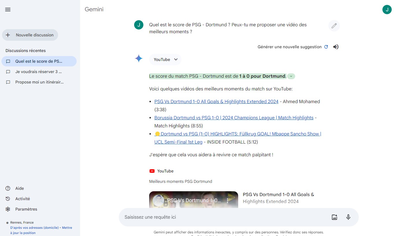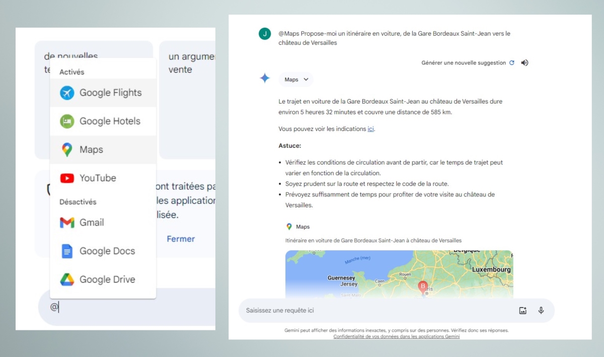 Google présente ainsi quelques exemples d’utilisation : Par exemple, si vous et vos amis planifiez un voyage, vous pouvez demander à Gemini de retrouver les dates dans Gmail qui conviennent à tout le monde, de rechercher des informations sur les vols et les hôtels en fonction de ces dates et de ce lieu, de trouver des vidéos YouTube sur ce qu’il faut emporter, et de résumer la liste de bagages mentionnée dans cette vidéo – le tout dans une seule conversation. » Les extensions sont d’ores et déjà disponibles en France.