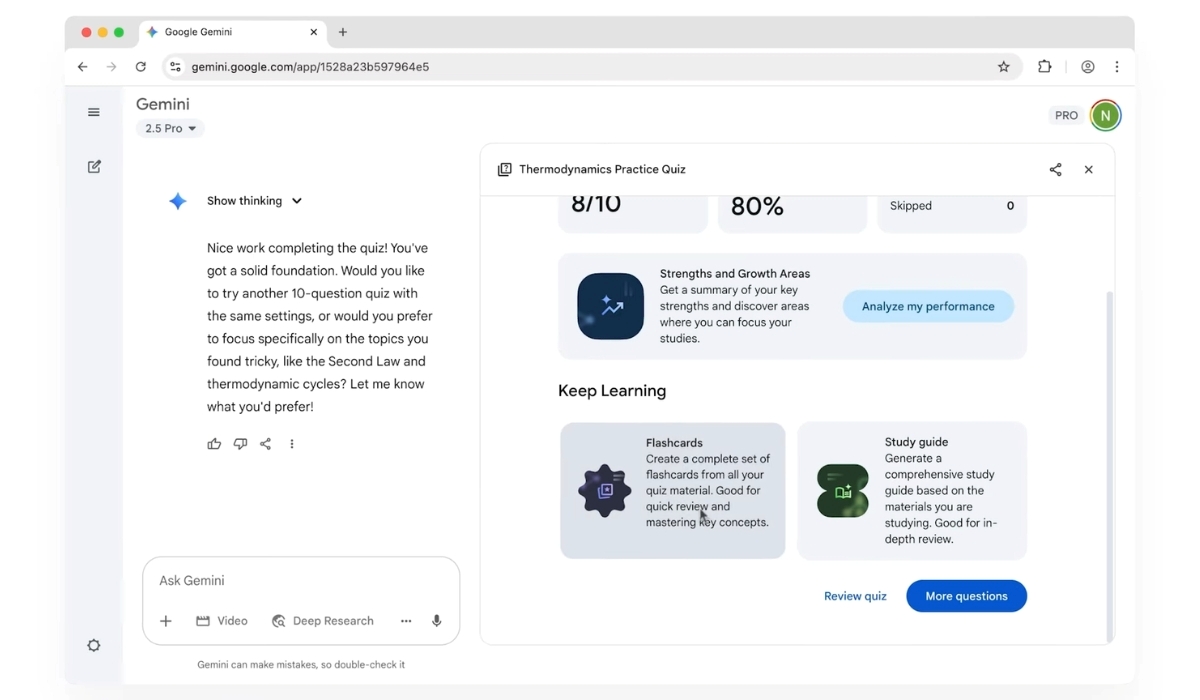 En complément, de nouveaux outils de préparation aux examens voient le jour. Vous pouvez, par exemple, demander à Gemini de créer des flashcards pour mémoriser des informations ou de concevoir un quiz.