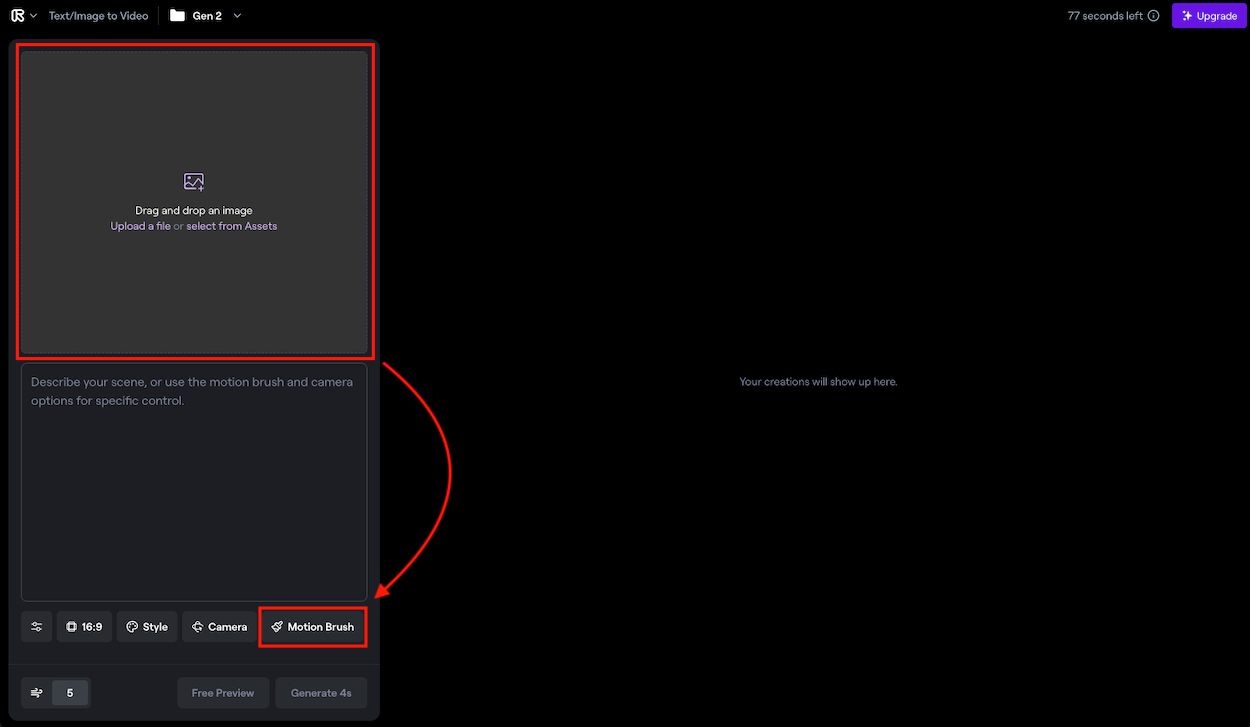 Dès lors que vous êtes sur l’interface de création, il vous sera possible d’uploader une image en cliquant sur le cadre prévu à cet effet ou en glissant-déposant votre visuel dans l’emplacement dédié. Puis, cliquez simplement sur Motion Brush, sous la boîte de dialogue destinée à accueillir un éventuel prompt.