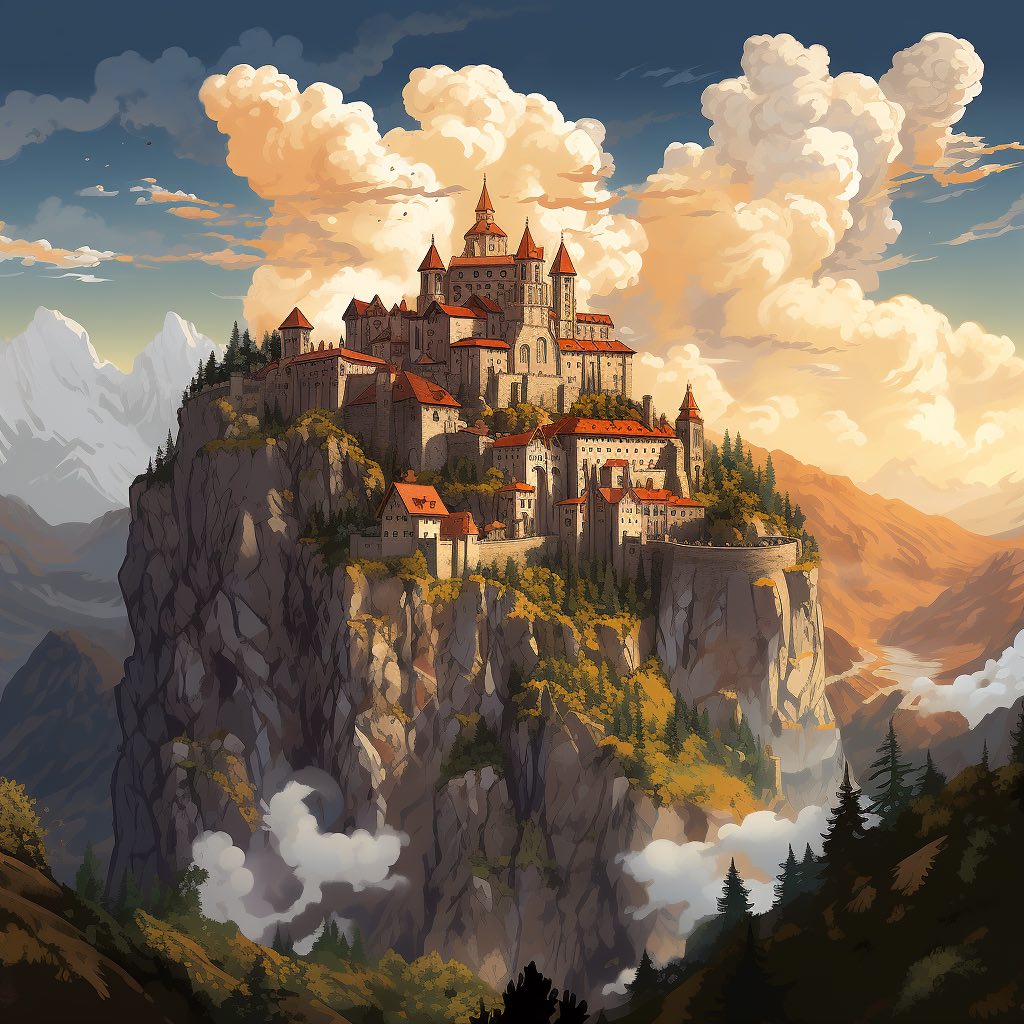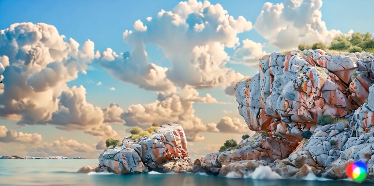 Voici comment, à partir d’une image fixe générée avec Midjourney (premier visuel), il nous a été possible d’animer les nuages, ceux de l’arrière-plan indépendamment de ceux du premier plan, en les faisant se déplacer de la droite vers la gauche :