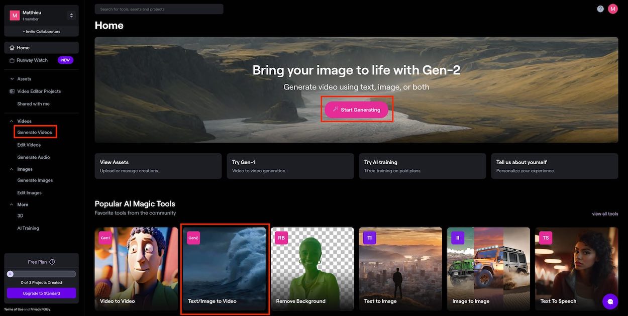 L’utilisation du Motion Brush est particulièrement simple et intuitive. Pour commencer, il vous faudra créer un compte gratuitement sur la plateforme de Runway. Celle-ci vous offre des crédits génératifs, équivalents à 104 secondes de vidéo. Une fois que vous êtes connecté à la plateforme de Runway, rendez-vous sur l’outil Text/Image to Video, ou cliquez sur Start Generating si la bannière de la page d’accueil vous propose de tester Gen-2. Vous pouvez aussi sélectionner Generate Videos dans le volet de navigation à gauche de l’écran, comme sur l’image ci-dessous.