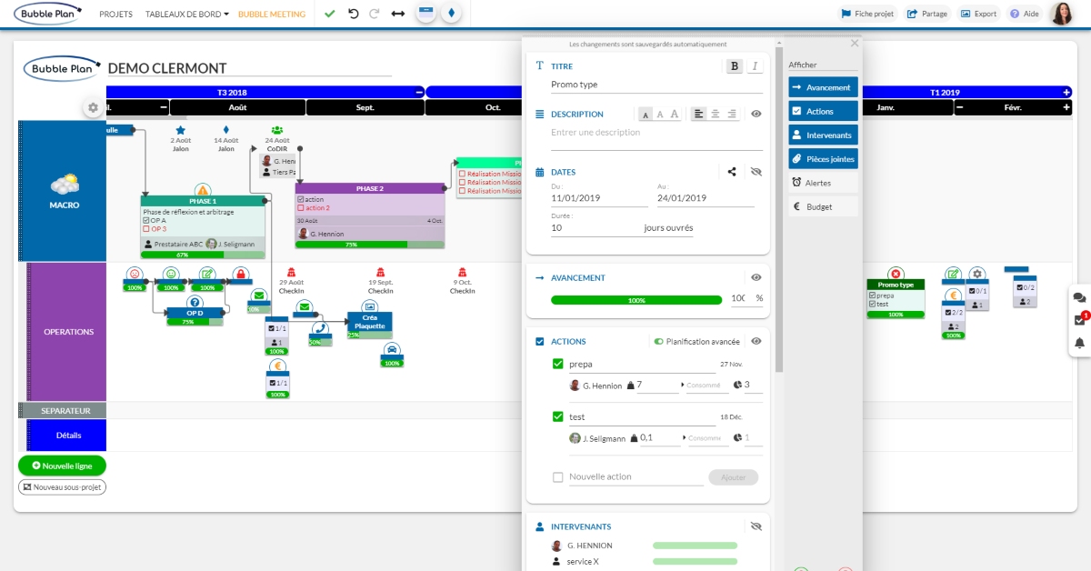 Un des freins à la gestion de projets est de vouloir « tout définir » avant de lancer le projet. Bubble Plan permet à l’inverse de se lancer tout de suite, même si vous n’avez pas défini les budgets, les équipes, les ressources… Vous gagnez du temps, et pouvez mettre en place une approche itérative : le projet est en mouvement et n’est pas figé.