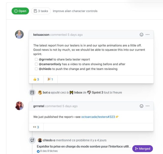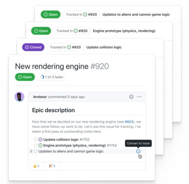 Dans le but d’aider les développeurs dans leur planification de projet, GitHub permet de diviser les issues en plusieurs tâches, avec des nouveaux indicateurs de progression pour suivre l’état d’avancement. Il est possible aussi de convertir des tâches en issues.
