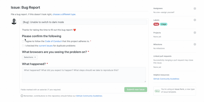Les issues qui sont soumis aux projets open source manquent la plupart du temps d’informations importantes. La configuration en YAML va permettre aux responsables de concevoir des formulaires structurés avec les champs requis. Les étapes seront faciles à suivre et permettront de saisir tous les détails importants.