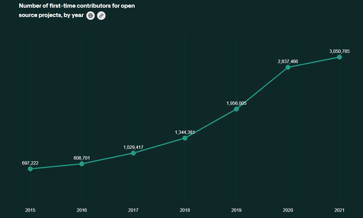 En 2021, la communauté des développeurs se renforce. On dénombre ainsi plus de 3 millions de premiers contributeurs à des projets open source dans le monde. Cela représente une hausse de 1,4 millions par rapport à 2020. (voir image ci-dessus)