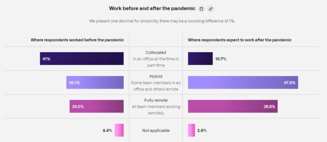 Les développeurs présentent un intérêt grandissant pour le travail hybride. Aujourd’hui, seulement 11 % des personnes interrogées envisagent un retour au bureau, soit une baisse de 30 % par rapport à la période pré-pandémie qui enregistrait 41 % des développeurs sur site. 47 % des développeurs s’attendent à une organisation hybride du travail, entre présentiel et distanciel. Ils sont 39 % à envisager le télétravail à temps plein.