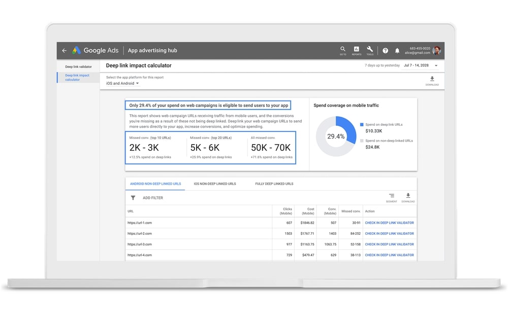 Afin de faciliter la création de liens profonds, vous pourrez utiliser le validateur de liens profonds ainsi qu’un outil pour calculer leur impact, à retrouver directement dans l’onglet « outils » de Google Ads.