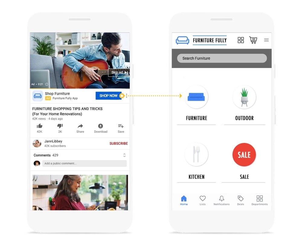 Les liens profonds sont des URL de destination qui, sur une annonce, redirigent les internautes vers une page précise de l’application (achat d’un type de produit, réservation d’un hôtel, etc.). Selon Google, ces liens permettent de doubler votre taux de conversion moyen, grâce à une expérience publicitaire personnalisée.