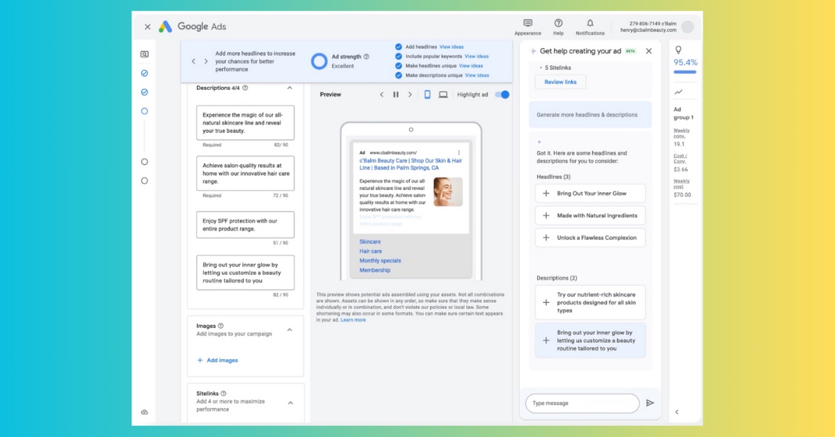 Et c’est bien le modèle de langage maison de Google, Gemini, qui alimentera cette nouvelle façon de créer des annonces publicitaires : « Nous avons activement testé Gemini pour améliorer davantage nos solutions publicitaires. Et, nous sommes ravis de partager que Gemini alimente désormais l’expérience conversationnelle. C’est la première de nombreuses intégrations de Gemini à venir. » En outre, un système d’évaluation des annonces, appelé Ad Strenght (Force de l’annonce), mesurera la pertinence, la qualité et la diversité de votre publicité en lui attribuant un score de « Faible » (Poor) à « Excellent ».
