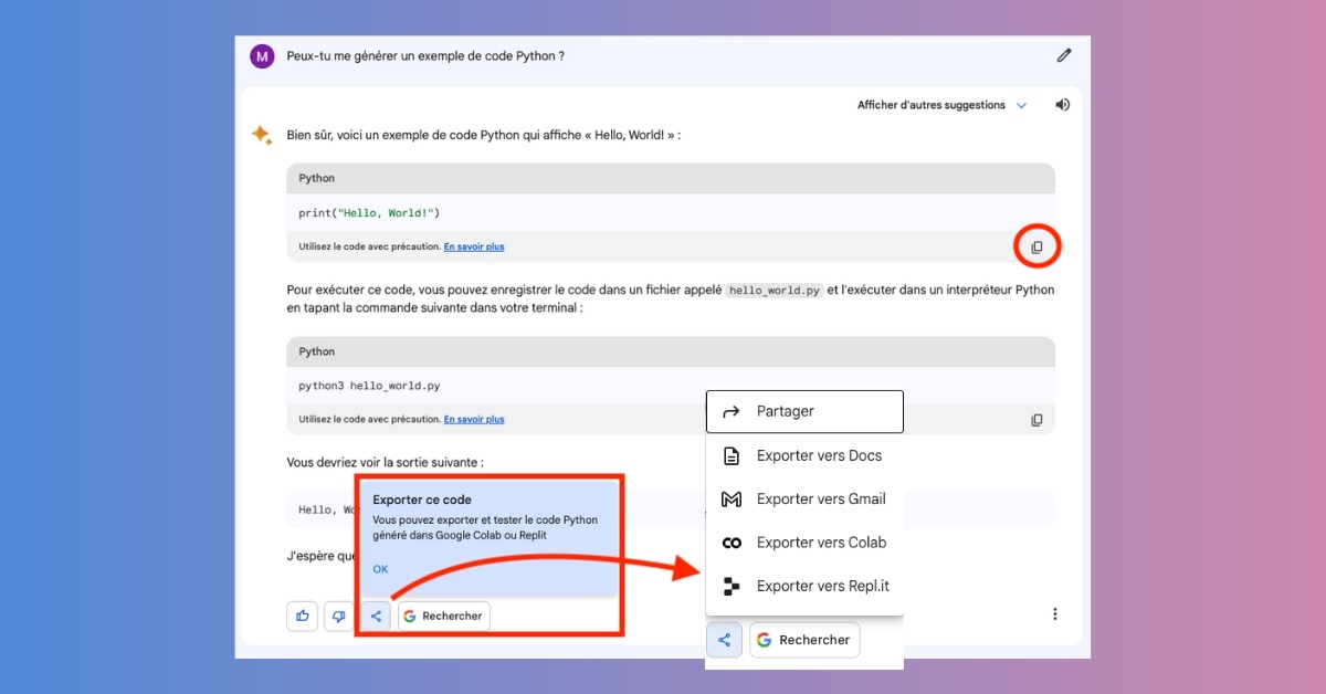 Comme ChatGPT, Bard est capable de rédiger du code, comme dans l’exemple très simple demandé ci-dessous. Mais l’outil vous permet surtout de l’exporter en un clic vers Google Colab s’il s’agit de code Python, ou vers Replit. Dans le premier cas, un nouveau notebook Google Colab sera enregistré dans votre Drive. Dans le second, une fois les conditions acceptées et votre compte Replit lié, le prompt et la réponse de Bard y seront envoyés. Le bouton de partage donne accès à ces options, tandis qu’un bouton pour copier directement du code depuis votre conversation avec Bard est accessible au sein des blocs générés.