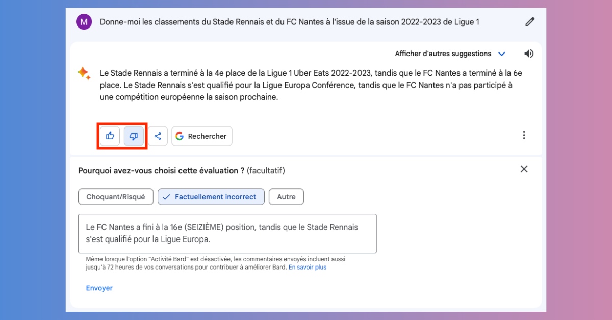 Comme vous avez pu le voir dans certains des exemples générés dans cet article, Bard est loin d’être parfait et Google en est conscient. Son outil est « expérimental » et l’IA prévient qu’elle a « des limites et peu[t] parfois [se] tromper ». C’est pourquoi Google vous permet de confirmer ou invalider les réponses de Bard en lui mettant un pouce vers le haut ou vers le bas, comme sur YouTube. En choisissant l’option Mauvaise réponse, Bard vous proposera d’en préciser la raison, en l’informant d’un contenu « choquant/risqué », d’une réponse « factuellement incorrecte » ou d’une autre raison. Cela aidera le modèle de langage à s’améliorer.