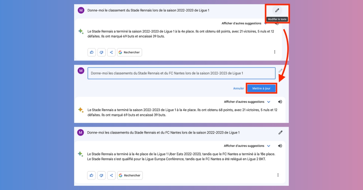 Comme ChatGPT, Bard va répondre à vos requêtes au sein d’une interface conversationnelle. Mais pour le moment, l’IA ne peut garder le contexte de votre discussion, cette fonctionnalité sera implantée petit à petit quand l’outil aura été entraîné à plus grande échelle. Cependant, il est possible d’éditer vos prompts dans Bard. Une fois votre requête effectuée et la réponse apportée, vous pouvez modifier votre demande initiale en cliquant sur l’icône en forme de crayon en haut à droite de votre prompt. En l’éditant, puis en validant, Bard générera une nouvelle réponse. À noter qu’il n’est possible d’éditer que votre dernier prompt.