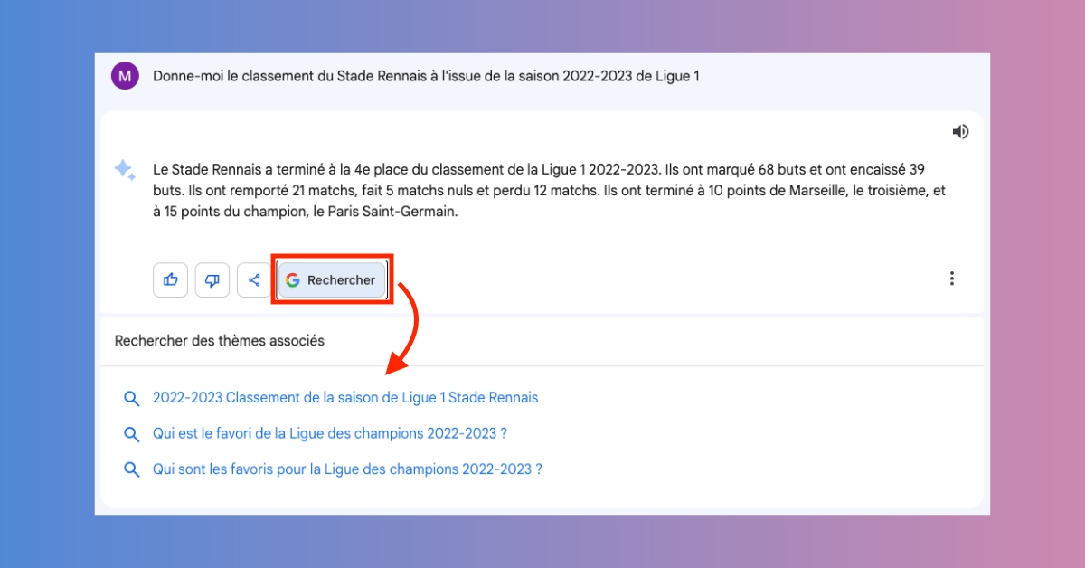Bard et Search sont étroitement liés. L’agent conversationnel et le moteur de recherche de Google travaillent de concert. D’ailleurs, Bard peut, si vous le souhaitez, vous renvoyer directement vers des recherches Google à l’issue de ses réponses. Un bouton Rechercher avec l’icône Google vous attend sous la réponse générée. En cliquant dessus, l’outil vous propose de « rechercher des thèmes associés » en vous suggérant 3 recherches Google.