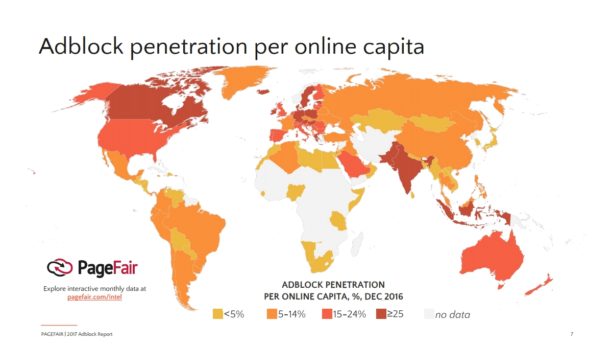 En France, 11% des internautes bloquent les publicités sur leur navigateur (très majoritairement sur desktop, contrairement aux internautes asiatiques qui bloquent surtout les publicités sur mobile). La carte ci-dessous permet de visualiser l’adblocking dans le monde (source : PageFair, février 2017).