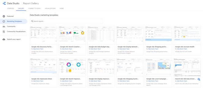 Google propose ses propres templates marketing. Ils permettent de visualiser vos données Google Analytics, Google Ads, YouTube…