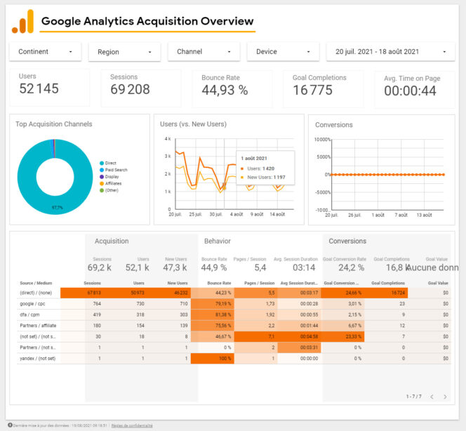 Vous pouvez par exemple utiliser un template Google Analytics qui résume l’acquisition de trafic de votre site. Basé, par défaut, sur les 30 derniers jours, il permet de visualiser la répartition de vos principales sources de trafic, le comportement des utilisateurs selon chaque source (taux de rebond, nombre de pages par session, temps de session…) ainsi que les conversions (taux de conversion des objectifs, nombre d’objectifs réalisés…). Des filtres permettent de regarder les données sur mobile ou sur desktop ou regrouper les données en fonction des groupes de canaux (Paid Search, Display, Affiliates…).
