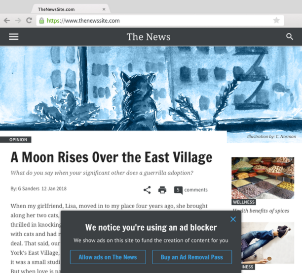 Google Funding Choices s’adresse aux lecteurs utilisant un Ad Blocker, et doit leur faire prendre conscience que cela impacte les revenus des médias. La fonctionnalité lancée en bêta il y a quelques mois aurait déjà permis (selon Google) de faire réactiver l’affichage de publicités à des millions d’utilisateurs, et d’augmenter de facto la rémunération des sites concernés. 4,5 millions d’utilisateurs auraient désactivé leur Ad Blocker grâce à Funding Choices, permettant la monétisation de 90 millions de pages. Cet affichage serait efficace pour provoquer une prise de conscience des lecteurs : 16% des visiteurs se rendant sur un site utilisant le service auraient désactivé leur Ad Blocker suite à l’affichage du pop-up. Dans les semaines à venir Google va déployer cet outil à 31 nouveaux pays et on peut légitimement penser que la France sera concernée. Notons que Google ne fournit aucune données sur les paiements générés par son outil. On peut donc imaginer que celui-ci est principalement efficace pour faire désactiver les Ad Blockers des visiteurs, mais génère peu de transactions payantes. La possibilité d’acheter un « ad removal pass » se fait via Google Contributor, et permet de profiter d’une navigation sans publicité en échange d’une donation financière.
