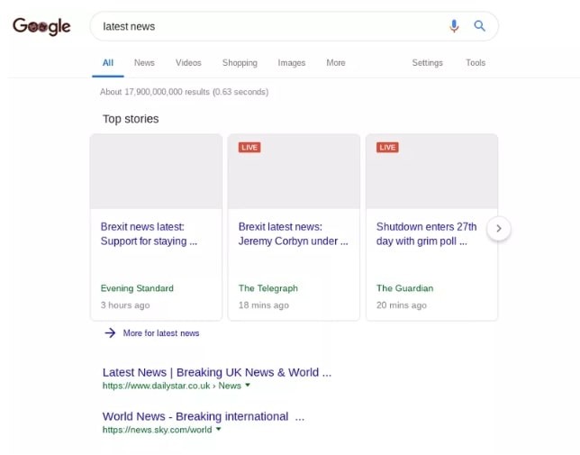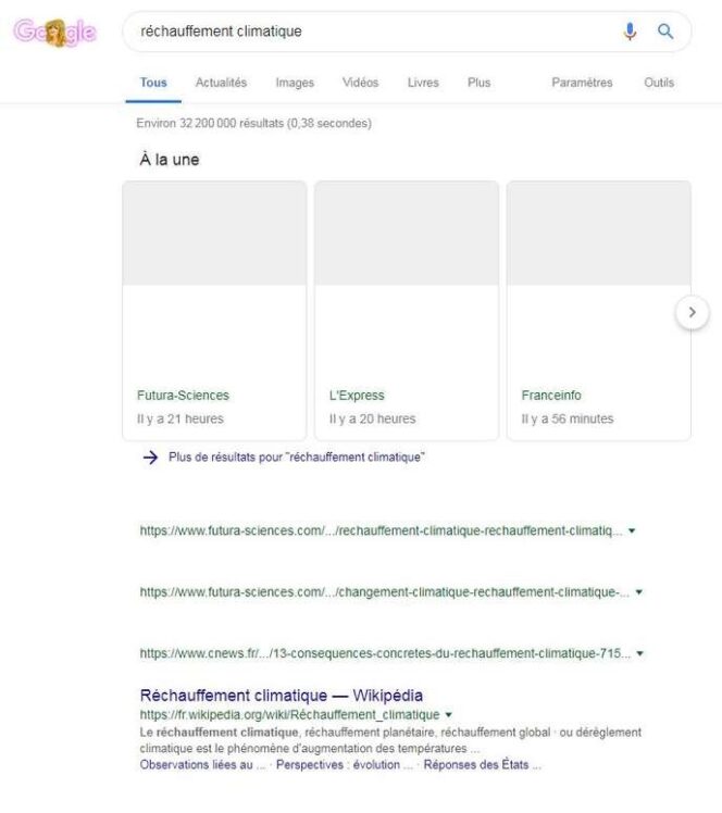 Sur certaines requêtes, la carte Google News apparaissait complètement vide. Dans d’autres cas, les titres des articles n’étaient même pas affichés : seuls le nom de la source et l’URL de l’article étaient présents. D’après le moteur de recherche, il s’agirait de tests, en prévision de l’adoption de la directive européenne sur les droits d’auteur.