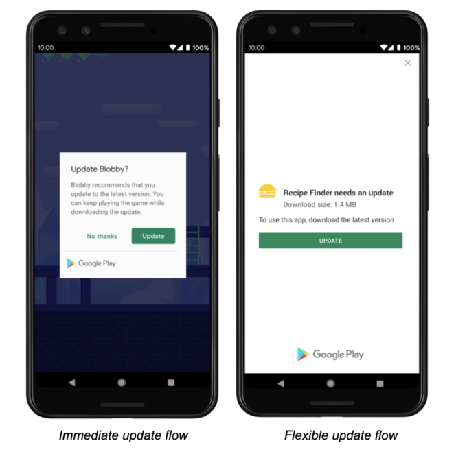 Afin d’encourager les utilisateurs à suivre le rythme, Google permet à présent la mise à jour directement depuis l’application (in-app updates). Deux types de parcours sont proposés (immédiat ou flexible), permettant ou non l’utilisation de l’app en parallèle.