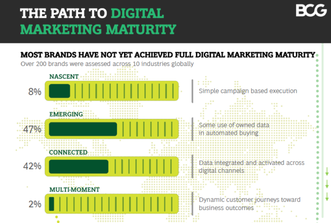 Dans une étude réalisée auprès de 40 entreprises européennes issues de 8 secteurs différents, Google et BCG ont déterminé que seulement 2% des entreprises tiraient pleinement parti du marketing digital analytique ou basé sur de la donnée (“data driven marketing”). La plupart des entreprises (47%) sont considérées comme émergentes dans leurs pratiques tandis que 42% des sociétés dont les données sont intégrées et activées sur tous les canaux numériques se voient catégorisées comme confirmées.