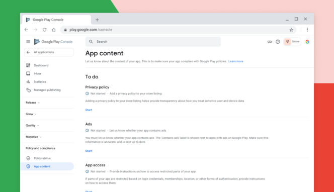 Google vous permet de fournir plus facilement les informations requises par Google Play pour que vos applications déployées soient en conformité avec leurs politiques. Vous retrouvez de nouvelles sections tout en bas de la barre de navigation de gauche avec toutes les informations nécessaires.