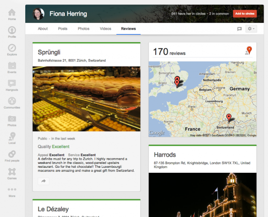 - L’ajout d’un onglet « Reviews« , répertoriant les recommandations locales ajoutées par l’internaute sur les pages Google+ Local.